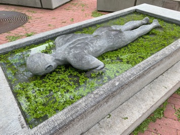 He must have looked like he was being stoned, the naked man who was himself made of stone. But by morning all was calm in the plaza in front of the Denver Art Museum. Tender green leaves, stripped during the night from the trees in a hailstorm (one leaf caught in the small of the man’s back) eased the sculpture’s severity and made the water a rejuvenating bath.