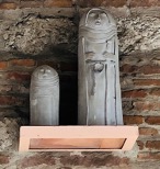 Which of these quirky characters watching over Auvillar shall I choose as guardian of my wanderings? The blue fellow with the spiked hair tipping over in his seat makes me laugh. I trust the stern rectitude of the two stone figures, even if I can’t decide whether they’re mother and child, nun and postulant, or monk and novice. The tumbling hiker inspires a sense of elasticity and adventure. I love that an artist thought about and designed and created each of these statues, just as I am trying to undertake my own creative act.
