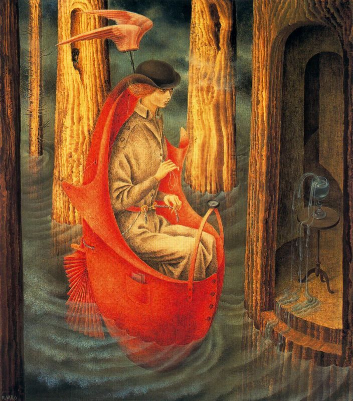 I remembered Exploration of the Sources of the Orinoco River, the intensity of the single figure, the rising water, the fountain. Varo’s 1959 work illustrates the quest journey in a manner not often seen. A woman dominates, she is the central image, and she is in control, calm but determined. She floats the river in a pink egg-shaped vessel with wings and a rudder, which she controls through a series of ropes and strings. The wings flare, water flows, she is moving on. She wears a safari dress and a man’s bowler hat for the water journey. The dress is the same tan as the bark on four trees which surround her, while the hat is actually a part of the egg/boat. Two dark birds peer from two of the trees.