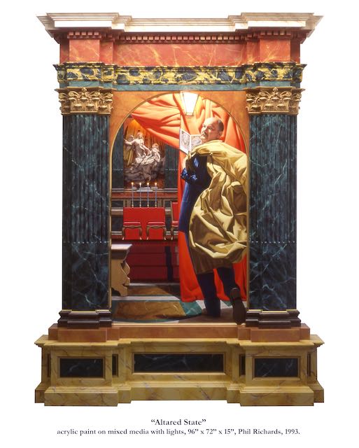 It’s been a long lonely winter. My dog died in December, and I have been housebound with a sick husband for months, COVID-19 running in the background like a bad movie. One of my favourite ways to drift through time and relax at home is to explore the thousands of photos on my computer. I’m reminded of happier days of freedom and creativity. Whole stories play out in the photos. I recently found a photo of Altared State, by renowned Canadian portrait painter Phil Richards. It’s a beautifully constructed interpretation of the Cornaro Chapel in the church of Santa Maria della Vittoria that has fascinated me for a long time. I have always found it beautifully theatrical, grandiose, and carnal.