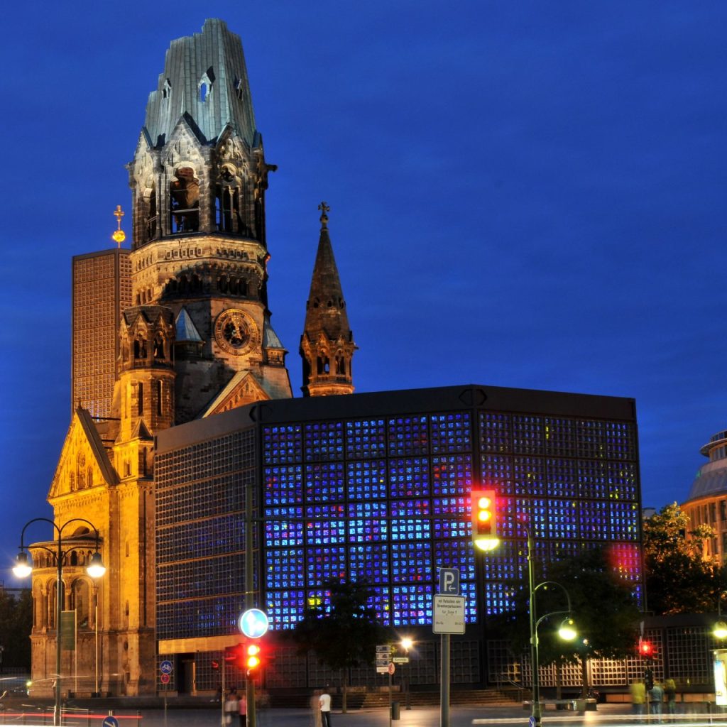 There is an old church that still stands in the western heart of the city of Berlin, the Kaiser-Wilhelm-Gedächtniskirche. It was raided by Allied bombs in 1943. All that was left was a damaged belfry and a section of the narthex. The church was built at the end of the nineteenth century by Kaiser Wilhelm II to honor his grandfather, Kaiser Wilhelm I. It was built in a traditionalist, Romanesque Revival style, a monument to its medieval predecessor. I admit, though, something of what is left of its sawed-off, green-bronze spire suggests to me a hint of the Gothic. It was carved out of yellowish-blonde tuff stone, volcanic ash pressurized into rock. The gilded metal hands of the clock above the archway keep a still moment in time.