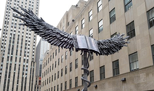 Flying books didn’t sprout their own pinions until late in the 20th century. Then, little glyphs of winged books began to appear, with thousands now posted for download. In Anselm Kiefer’s Book With Wings (1992–1994) and Uraeus (2017–2018), books fly on thickly feathered wings sculpted of lead and steel. Kiefer said that that “the book, the idea of a book or the image of a book, is a symbol of learning, or transmitting knowledge.” But Kiefer’s massive, leaden wings suggest that the transmission isn’t always easy. Flight can take a lot of energy—sometimes enough to pull a plane out of a nose dive.