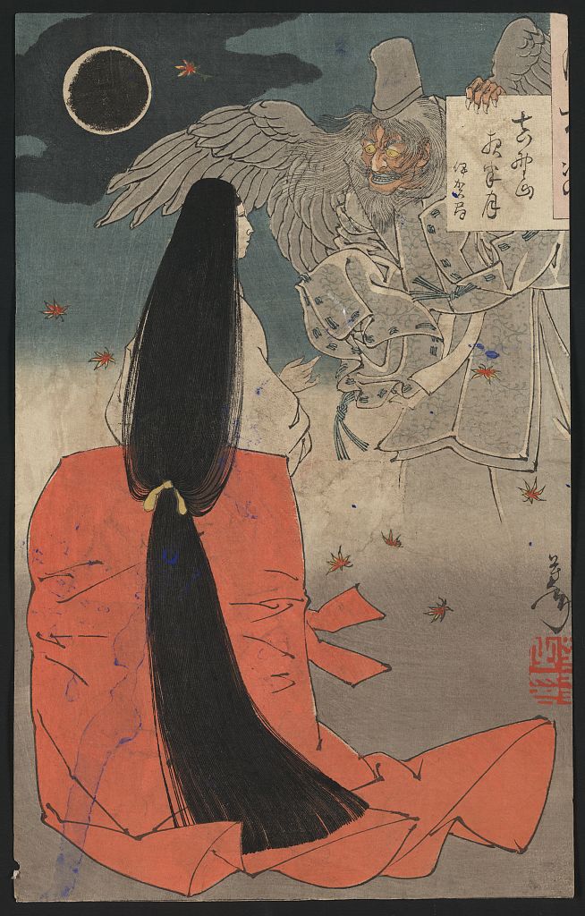 The flight of books is not always a job for an angel. Demons may have wings, too, and make mischief by transporting a book. The demonology of Japan is a fruitful source of monsters that wield books, scrolls, and placards. Taiso Yoshitoshi depicted one of these fiends in the woodcut, Manosan yowa no tsuki (Night Moon Over Mount Manno, ~1880). Under a darkened moon, a woman with very long hair listens to a wide-winged demon that holds up a page of writing.