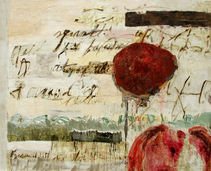 So to this painting, Bitter Heart, which starts out the same way as its contemporaries, but then takes a dangerous swerve with the introduction of two violently assertive orbs that hover menacingly above the words on the canvas. The lower of the two orbs is slightly more reticent. Paler, and not full constituted in the center (one can see the unobscured words peeking through), it seems to be rising, drifting into existence. Not so the upper orb. Smaller, it’s a fully present ovoid, like a misshapen egg. Deep encrusted reds, like a wound scabbing over, but also with a limpid translucence, like the lizardy skin of a ripe pomegranate.
