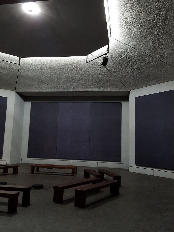 On my first trip there in 2010, solo and crackling with excitement, I all but leapt through the little anteroom of books and souvenirs for the second door into the sanctum sanctorum. The inner chamber houses fourteen site-specific paintings, the paintings Rothko decided would be his last. Just as I reached for the door handle, what seemed like the only staffer noted, “There’s a prayer group in there, but you won’t bother them.”