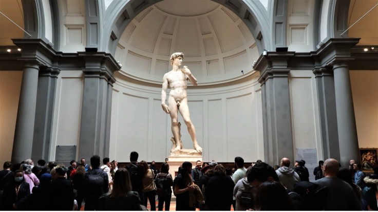 We managed to catch the train to Florence next morning. Crowds and tour groups, school field trips, hordes, and couples converged there with us on the longest line in the world, where now we waited under an umbrella for an hour, then two, before the rope dropped to grant us entrance to the famous museum.