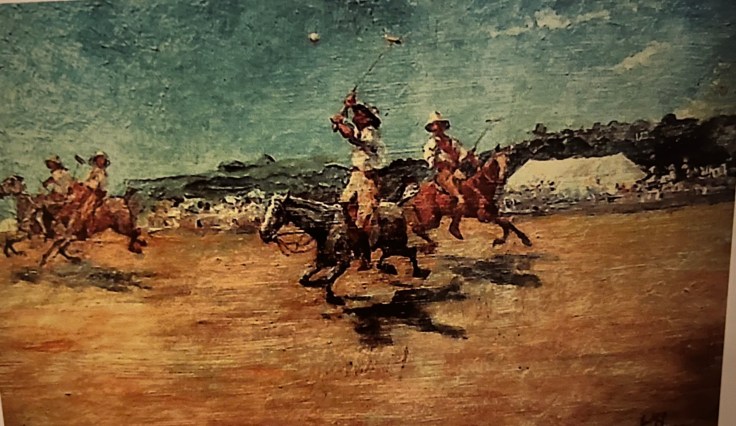 Despite its steel-blue sky and mottled-saffron turf, the oil painting is unassuming, its dimensions approximating a hardcover novel. Tidy brushstrokes portray a scene from a polo match — not the sleek power of the modern professional game, but one played at the turn of the 19th century, judging from the sturdy ponies and the players’ uniforms (loose khaki breeches and blousy shirts, topped by wide-brimmed pith helmets, better-suited for a sightseeing safari than a violent fall off a horse). The central figure, astride a galloping pony, hits an airborne ball. But to the trained eye, the subject matter is unusual.